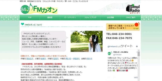 神奈川県央地域の方はワイドFMなどFM84.2MHz、圏外にお住まいの方へはスマホのアプリ「リッスンラジオ(リスラジなどで検索)」をダウンロード。FMカオンで検索。PCの場合は「サイマルラジオ」で検索。